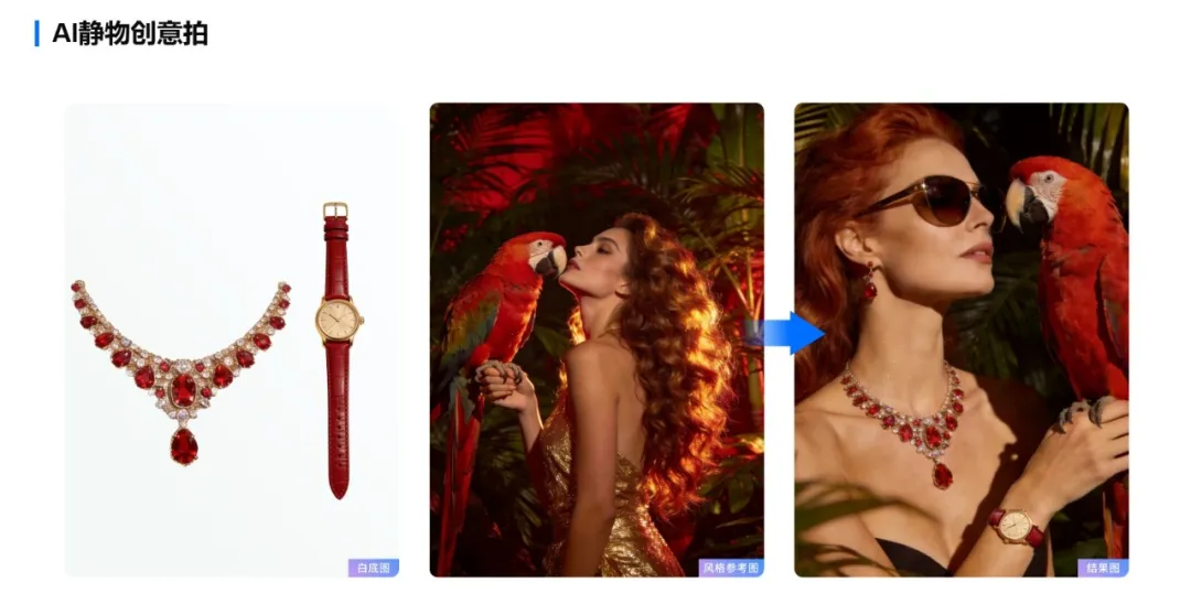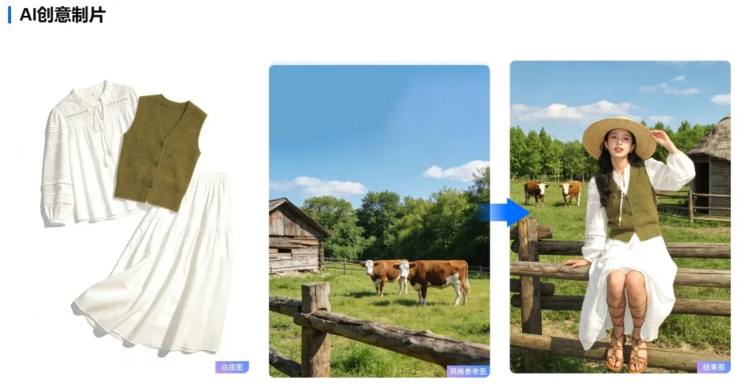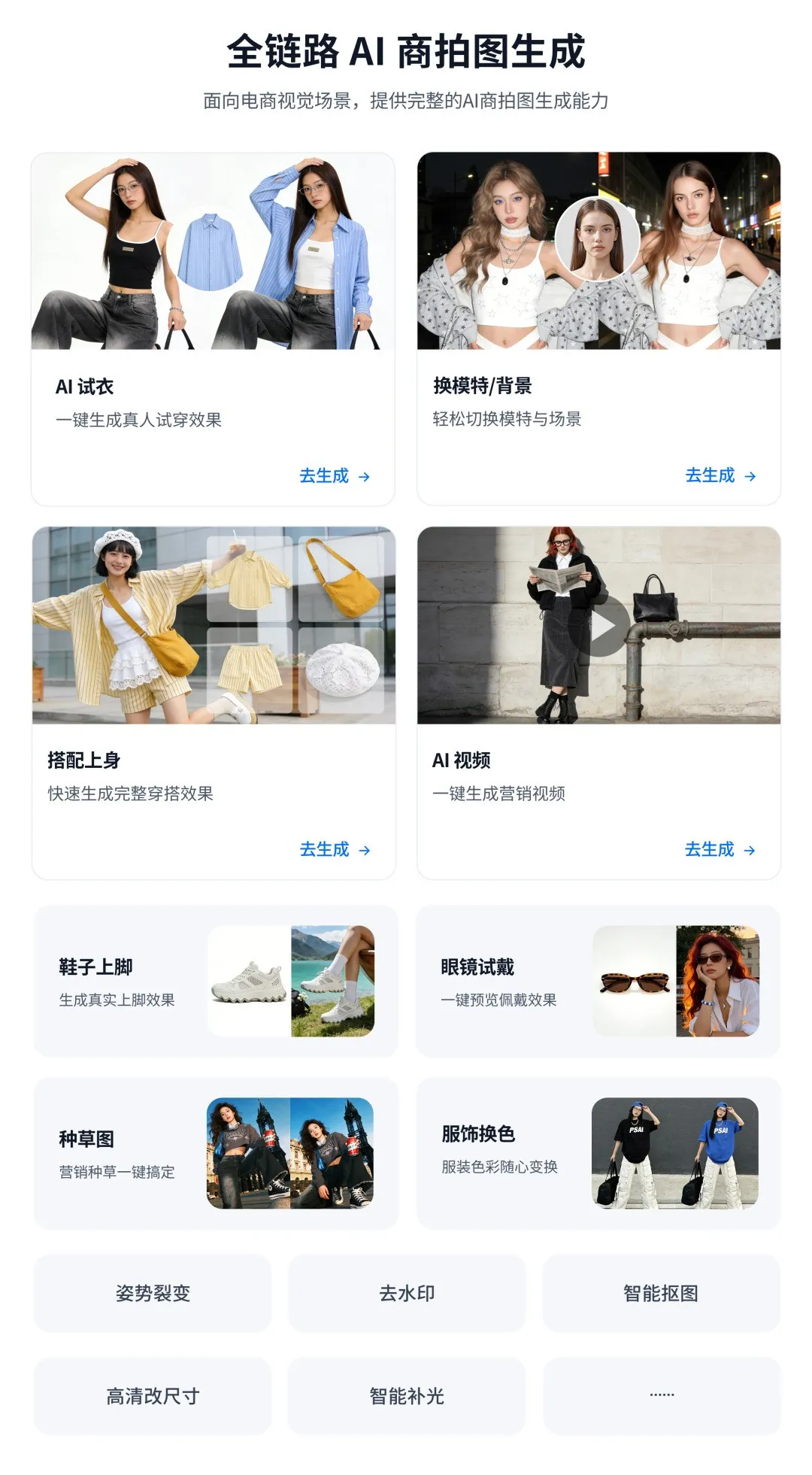 帮助商家实现包括AI试衣、AI换模特/换背景、AI姿势裂变、AI服饰换色、AI搭配生成、AI种草图、AI服配上身、AI视频等能力,显著提升了内容生产效率,降低商拍门槛。