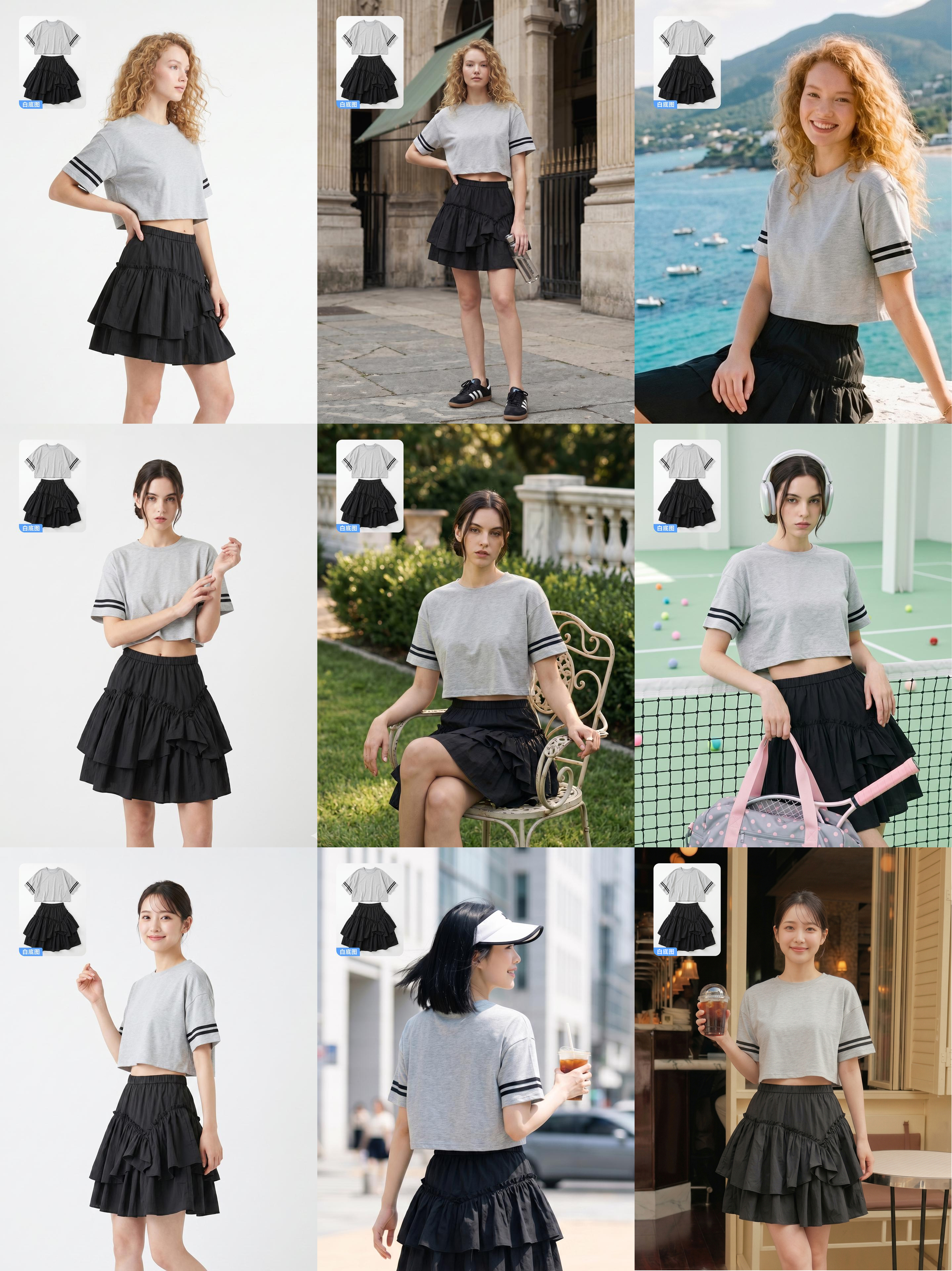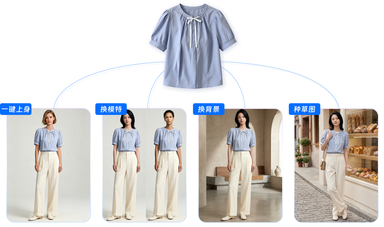 相比个人标准版,PSAI企业版的核心价值在于将原本分散的视觉生产环节整合成一条流畅的流水线。当运营团队需要为200款新品筹备商拍素材时,整个流程可以从上传基础样衣图开始,利用AI试衣功能将服装“穿”到不同身型的模特身上,再通过换模特、换背景功能快速生成多场景、多风格的商拍图;同一款式的不同配色也可以一键完成替换。